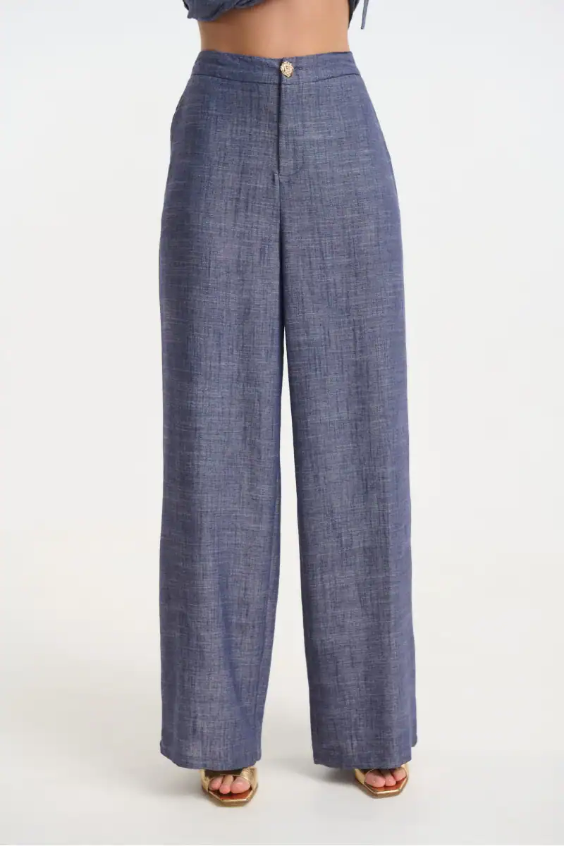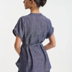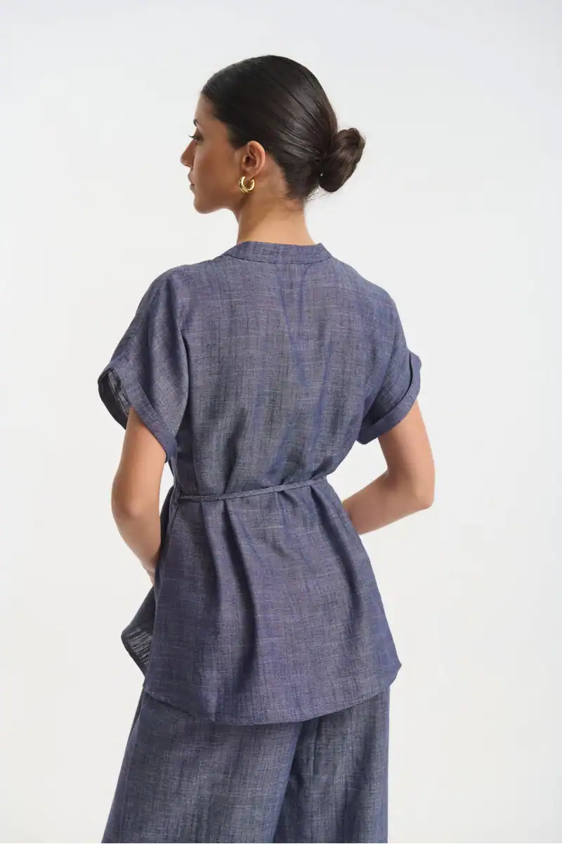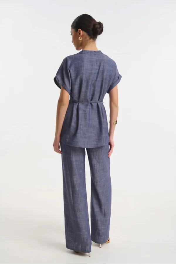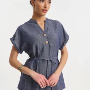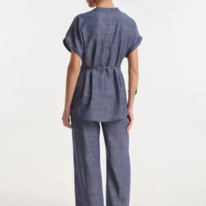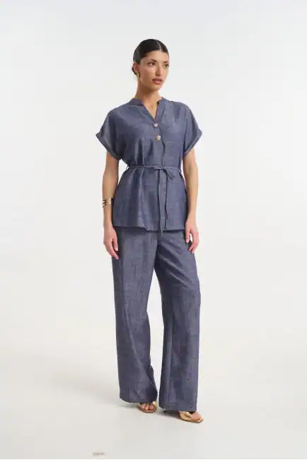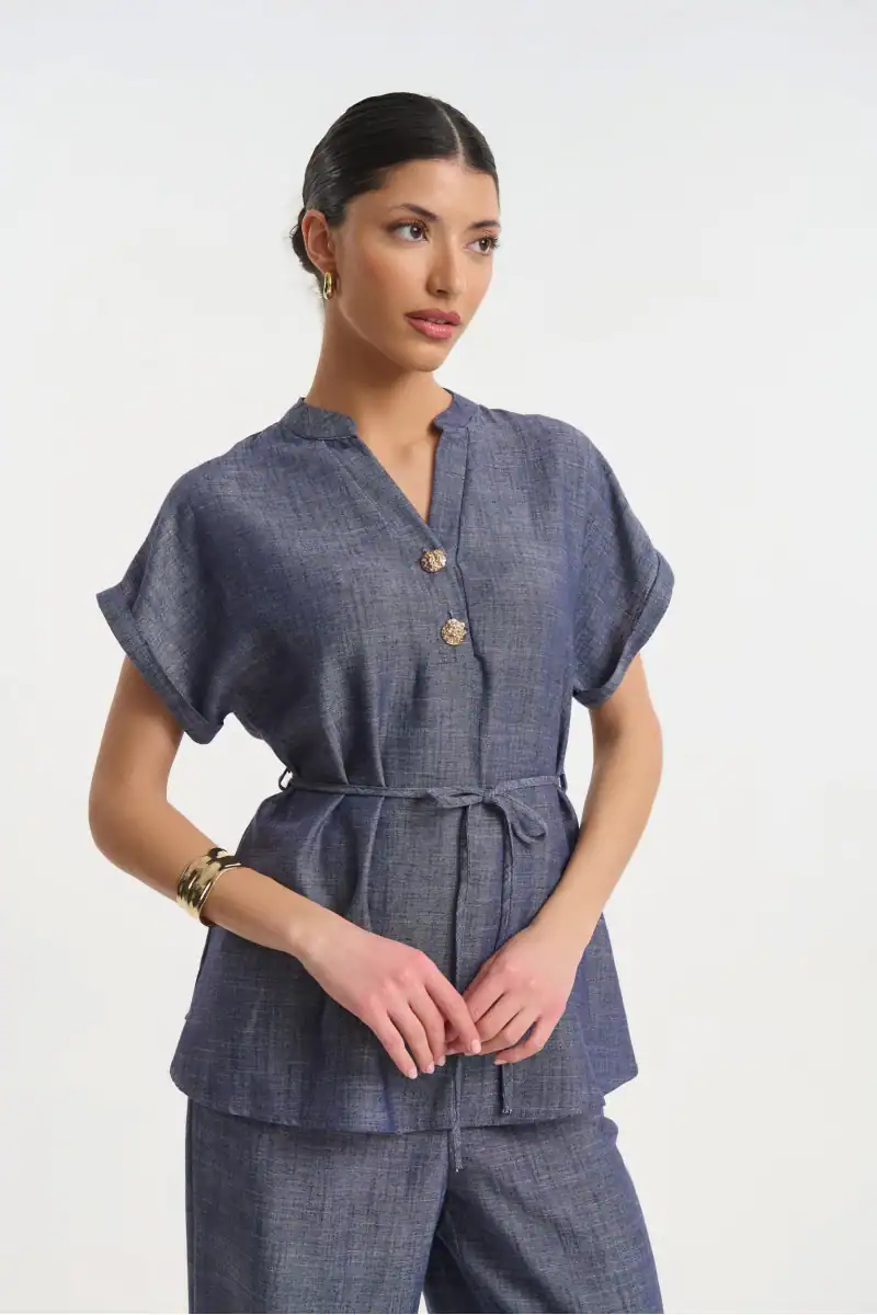 Σετ που αποτελείται από κοντομάνικη μπλούζα και παντελόνα, η μπλούζα έχει μπροστά χρυσά κουμπιά και αποσπώμενη ζώνη στη μέση ίδιου υφάσματος και χρώματος, η παντελόνα κλείνει μπροστά με φερμουάρ και χρυσό κουμπί, έχει τσέπες και λάστιχο στο πίσω μέρος για καλύτερη εφαρμογή.