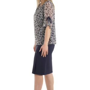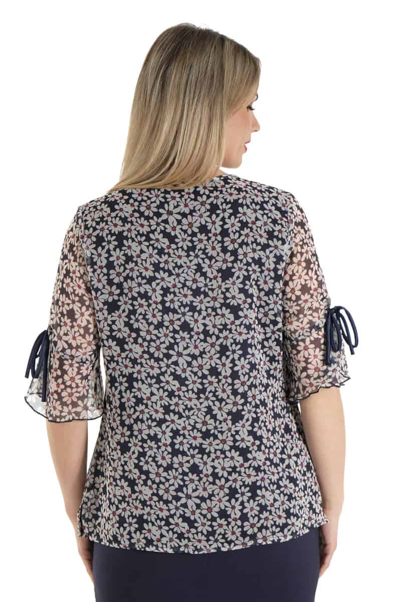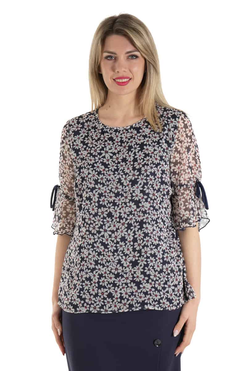Μπλούζα λαιμόκοψη σε ύφασμα μουσελίνα εμπριμέ , σε κλασική γραμμή με σκισίματα στο πλαϊ και φινετσάτο μανίκι που το κάνει να ξεχωρίζει.