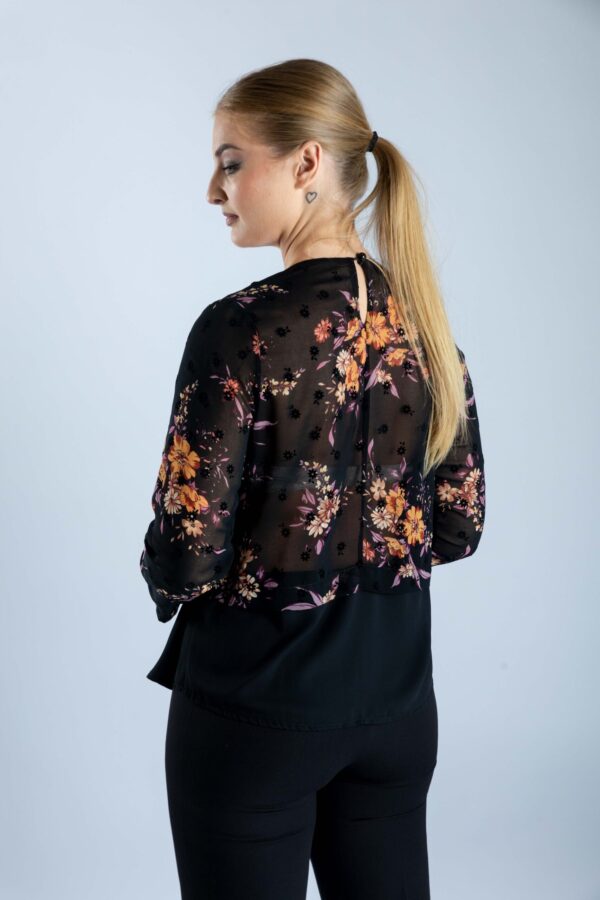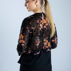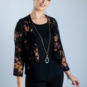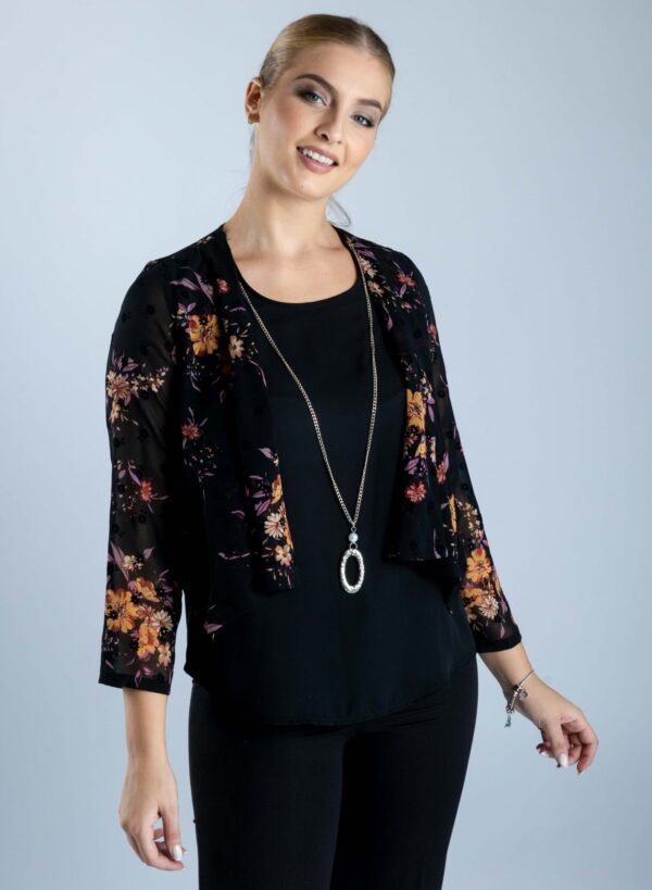 Μπλούζα μονόχρωμη μαύρη , με ενσωματωμένο ζακετάκι εμπριμέ ασύμετρο. Με λαιμόκοψη και ασημί αλυσιδάκι που στολίζει το μπούστο. Ένα πολύ διαφορετικό ρούχο στην καρνταρόμπα σας που θα σας κάνει να ξεχωρίζετε.