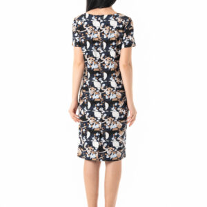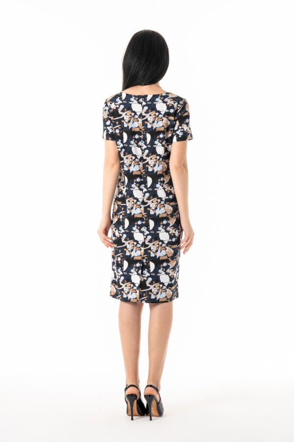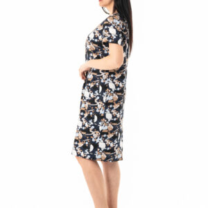 Φόρεμα εμπριμέ με βάση το μπλε σκούρο και σχέδια σε γήινες αποχρώσεις , σε ίσια γραμμή με κοντό μανίκι και λαιμόκοψη. Πολύ δροσερό και ευχάριστο ύφασμα λόγω της ποιότητας του.