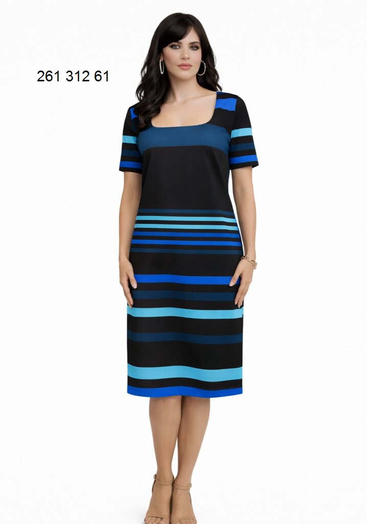 Φόρεμα μίντι με κοντό μανίκι και λαιμόκοψη , σε ίσια γραμμή , με βάση το μαύρο και ρίγες σε αποχρώσεις του μπλε .