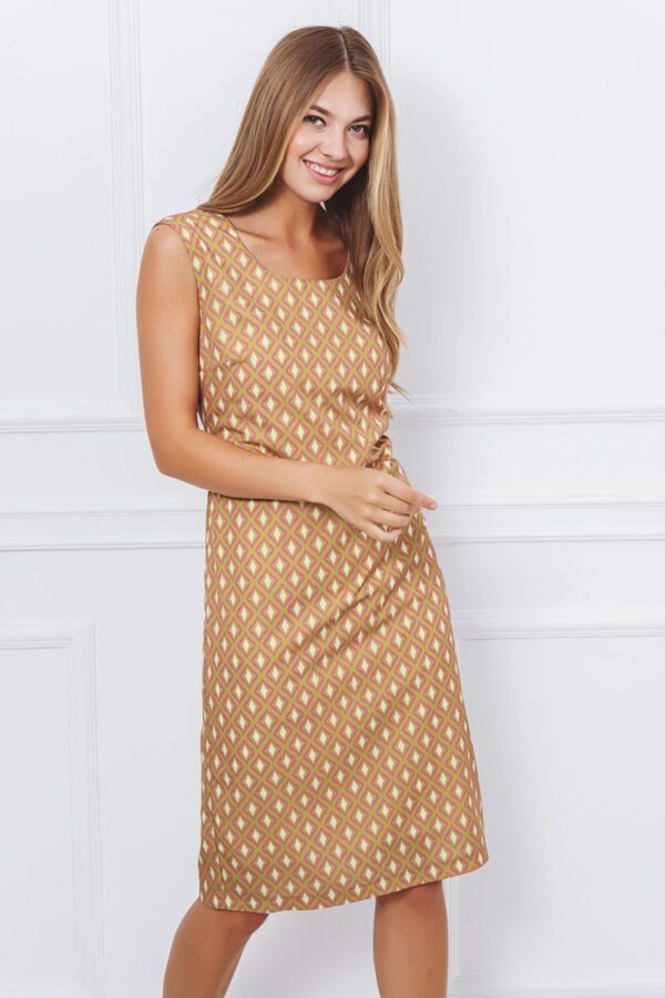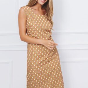 Μίντι αμάνικο φόρεμα με γεωμετρικά σχέδια και στρόγγυλη λαιμόκοψη, άνοιγμα στο πίσω κάτω μέρος, κλείσιμο πίσω με κρυφό φερμουάρ στη ραφή, φοδραρισμένο για καλύτερη εφαρμογή. Διαθέτει εξτρά μανίκια για τοποθέτηση.Ιδανικό για σικ εμφανίσεις.